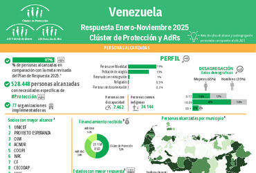 The Protection Cluster in Venezuela was activated to ensure the coordination of protection interventions in emergencies and to respond to the protection needs of persons affected by conflict and disasters. It is composed of the Gender-Based Violence (GBV) Area of Responsibility (AoR), and the Child Protection (CP) Area of Responsibility (AoR). The Protection Cluster is led by the United Nations High Commissioner for Refugees (UNHCR).