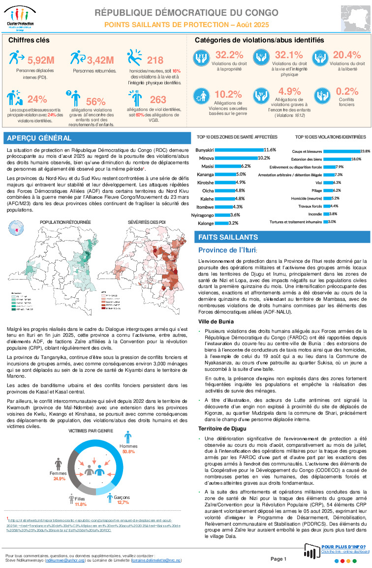 La situation de protection en République Démocratique du Congo (RDC) demeure préoccupante au mois d’aout 2025 au regard de la poursuite des violations/abus des droits humains observés, bien qu’une diminution du nombre de déplacements de personnes ait également été observé pour la même période
