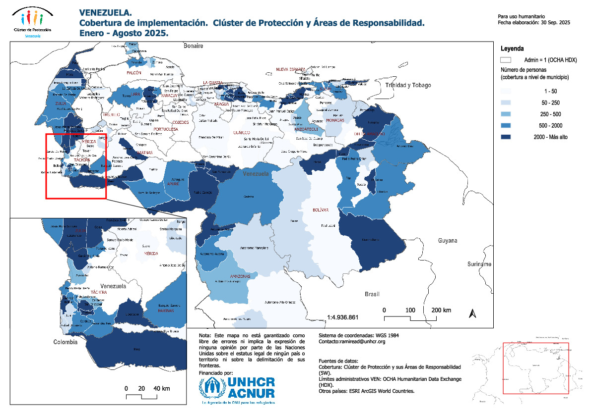 Mapa con la cobertura de implementación de actividades del Clúster de Protección y las áreas de responsabilidad de NNA y VbG en Venezuela entre los meses de enero y agosto 2025. Presenta información del alcance de la respuesta a nivel de municipios.