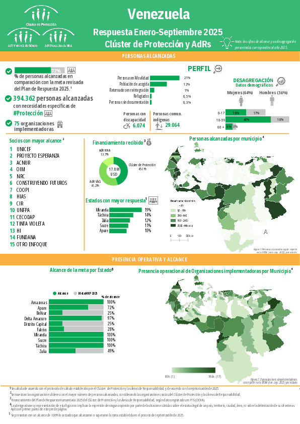 Factsheet con información sobre la respuesta de Venezuela correspondiente al período Enero-Septiembre 2025. Se incluyen datos de las AdRs de VBG y de Protección de la Infancia.