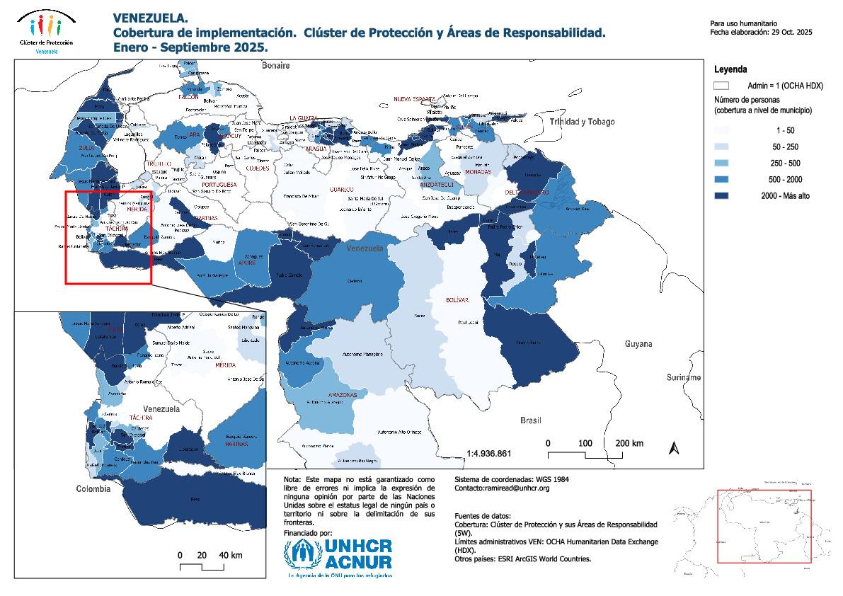 Mapa con la cobertura de implementación de actividades del Clúster de Protección y las Áreas de Responsabilidad de NNA y VbG en Venezuela entre los meses de enero y septiembre 2025. Presenta información del alcance de la respuesta a nivel de municipios.