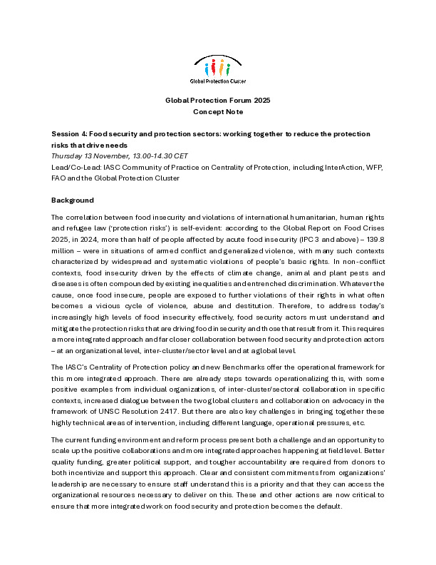 This document is the concept note for the Global Protection Forum 2025, Session 4: Food Security and Protection Sectors: Working Together to Reduce the Protection Risks that Drive Needs, taking place on Thursday 13 November, 13.00-14.30 CET