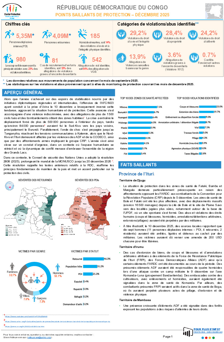 Alors que l’année s’achevait sur des espoirs de stabilisation nourris par des initiatives diplomatiques régionales et internationales, l’offensive de l’AFC/M23 ayant conduit à la prise d’Uvira le 10 décembre a brusquement inversé cette tendance, aggravant la situation humanitaire et de protection. Cette avancée s’est accompagnée d’une violence indiscriminée, avec des allégations de plus de 1 500 civils tués et des bombardements ciblant des zones habitées. La crise a entraîné le déplacement forcé de plus de 500 000 personnes à l’intérieur du pays, tandis qu’environ 84 000 personnes auraient fui le Sud-Kivu vers les pays voisins, principalement le Burundi. Parallèlement, l’onde de choc s’est propagée jusqu’au Tanganyika, réactivant les tensions communautaires à Kalemie, alors que le Nord-Kivu et l’Ituri demeurent affectés par les violences des ADF et de la CODECO, ainsi que par des affrontements armés impliquant le groupe CRP. L’année s’est ainsi close sur un constat d’urgence, dans un contexte où l’espace humanitaire se rétrécit et où la dynamique de conflit menace d’embraser l’ensemble de la région des Grands Lacs.