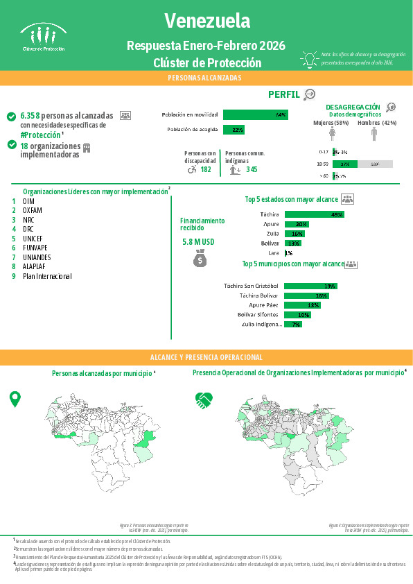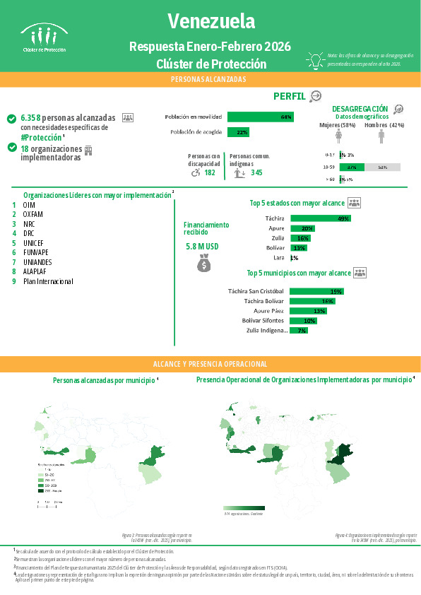 Factsheet con información sobre la respuesta de Venezuela correspondiente al período enero-febrero 2026.  Se incluyen datos de las AdRs de VBG y de Protección de la Infancia.
