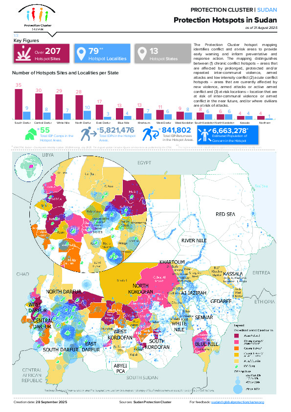 The Protection Cluster hotspot mapping identifies conflict and at-risk areas to provide early warning and inform preventative and response action. The mapping distinguishes between (1) chronic conflict hotspots – areas that are affected by prolonged, protracted and/or repeated inter-communal violence, armed attacks and low intensity conflict (2) acute conflict hotspots – areas that are currently affected by new violence, armed attacks or active armed conflict and (3) at-risk locations – location that are at risk of inter-communal violence or armed conflict in the near future, and/or where civilians are at risk of attacks.