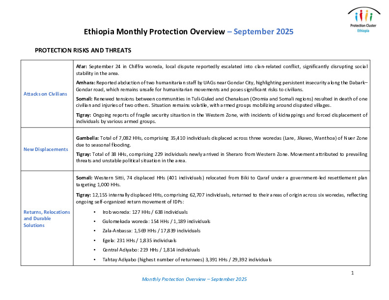 This document provides a monthly overview of key protection issues in Ethiopia, as well as programmatic and coordination achievements.