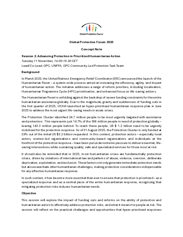 This document is the concept note for the Global Protection Forum 2025, Session 2: Advancing Protection in Prioritized Humanitarian Action, taking place on Tuesday 11 November, 14.00-15.30 CET
