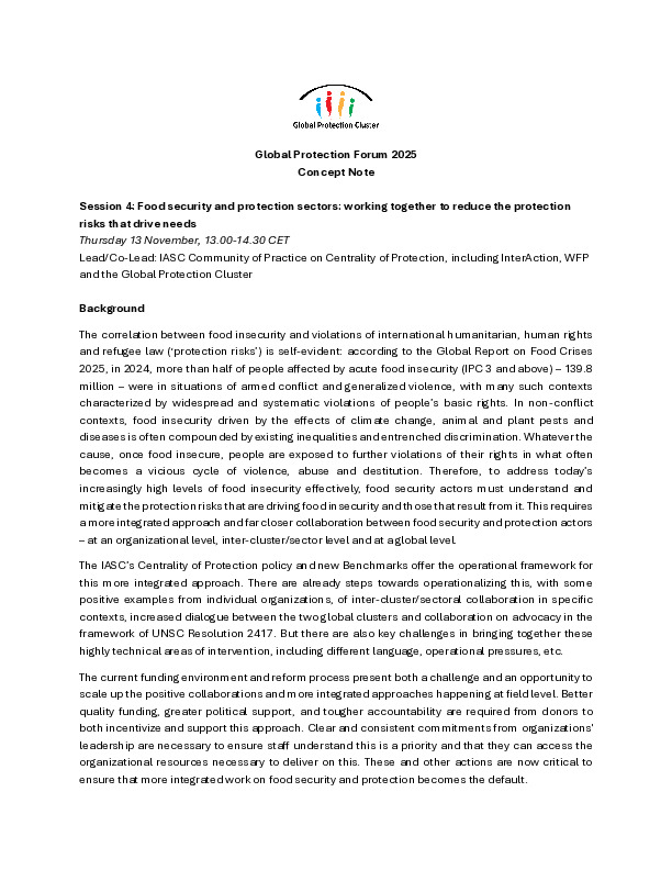 This document is the concept note for the Global Protection Forum 2025, Session 4: Food Security and Protection Sectors: Working Together to Reduce the Protection Risks that Drive Needs, taking place on Thursday 13 November, 13.00-14.30 CET