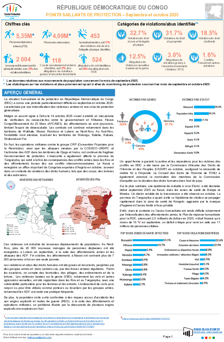 La situation humanitaire et de protection en République Démocratique du Congo (RDC) a connu une période particulièrement difficile en septembre et octobre 2025, caractérisée par une intensification des violences armées et une crise de protection généralisée.