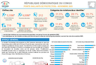 En Ituri, les opérations militaires contre le groupe CRP (Convention Populaire pour la Révolution), ainsi que les attaques menées par la CODECO-URDPC et l’activisme des ADF dans les territoires de Djugu et Irumu, ont continué de fragiliser l'environnement de protection. L'insécurité a également affecté la province du Tanganyika, qui subit à la fois les conséquences des conflits armés dans les Kivu et des affrontements locaux liés aux conflits intercommunautaires. Le Kasaï a enregistré un afflux important de Congolais expulsés d’Angola en octobre, souvent dans un contexte de violations des droits humains, tels que des coups, des tortures et des extorsions.
