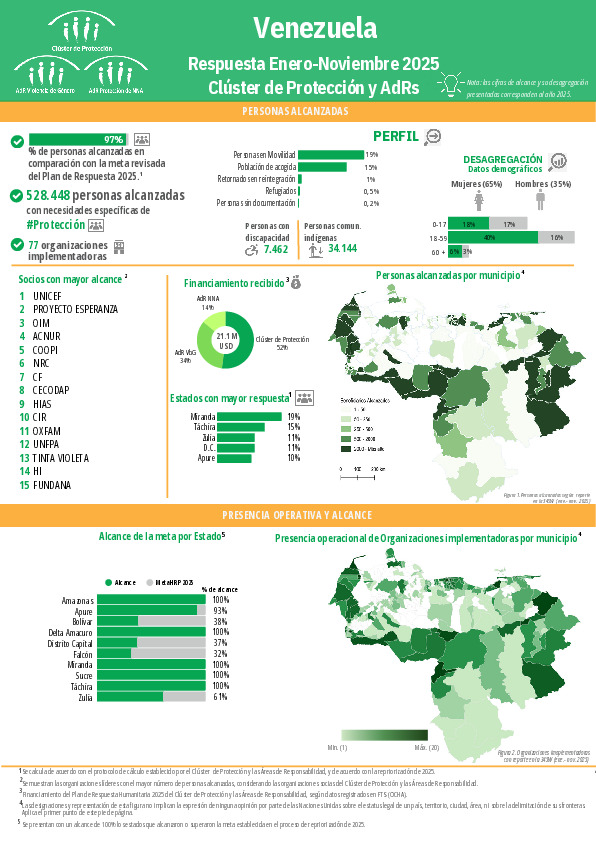 Factsheet con información sobre la respuesta de Venezuela correspondiente al período enero-noviembre 2025. Se incluyen datos de las AdRs de VBG y de Protección de la Infancia.
