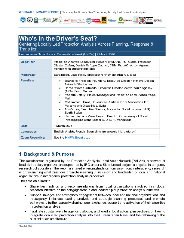 This is the outcome report of the HNPW 2026 event: Who’s in the Driver’s Seat? Centering Locally-Led Protection Analysis across Analysis-Informed Planning, Response and Transition.