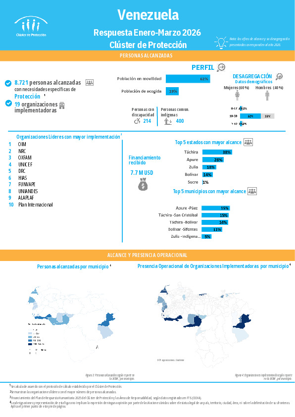 Factsheet con información sobre la respuesta de Venezuela correspondiente al período enero-marzo 2026.  Se incluyen datos de las AdRs de VBG y de Protección de la Infancia.