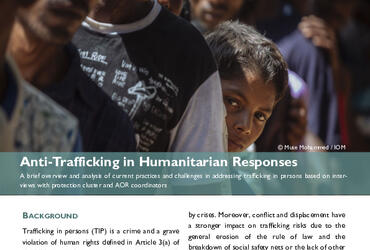 When the identified trends and cases of trafficking in persons are disproportionately affecting women and/or children – therefore requiring stronger responses by GBV and/or child protection actors – coordination might take place under the relevant areas of responsibility (AoRs). Regardless of the forum in which coordination takes place, the response needs to be closely coordinated with the GBV and CP AoRs to ensure that victims of trafficking are referred to relevant response services (case management and specialized response services) and included in referral pathways and standard operating procedures. The protection cluster coordinator should work with the relevant AoR coordinators and partners to identify the most appropriate coordination structure for the context. The priority is to ensure that trafficking in persons is included in protection assessments, relevant humanitarian strategies and the humanitarian programming cycle, and that victims of trafficking receive timely and effective assistance.