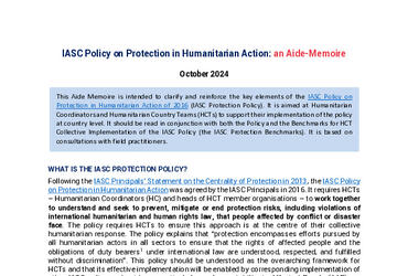 In October 2016, the Inter-Agency Standing Committee (IASC) adopted its Policy on Protection in Humanitarian Action. The policy defines the centrality of protection in humanitarian action, as per the December 2013 statement of the IASC Principals, as well as the process for its implementation at country level. In doing so, it seeks to reinforce complementary roles, mandates and expertise of all relevant actors. Specifically, the policy emphasizes an IASC commitment to prioritize protection and contribute to collective protection outcomes, including through the development of a Humanitarian Country Team (HCT) protection strategy to address the most critical and urgent risks and violations. It also underlines the need to implement this commitment in all aspects of humanitarian action and across the Humanitarian Programme Cycle (HPC). As such, the collective IASC roles and responsibilities in placing protection at the center of humanitarian action are explained, with due consideration for mandates and expertise and in line with humanitarian principles.