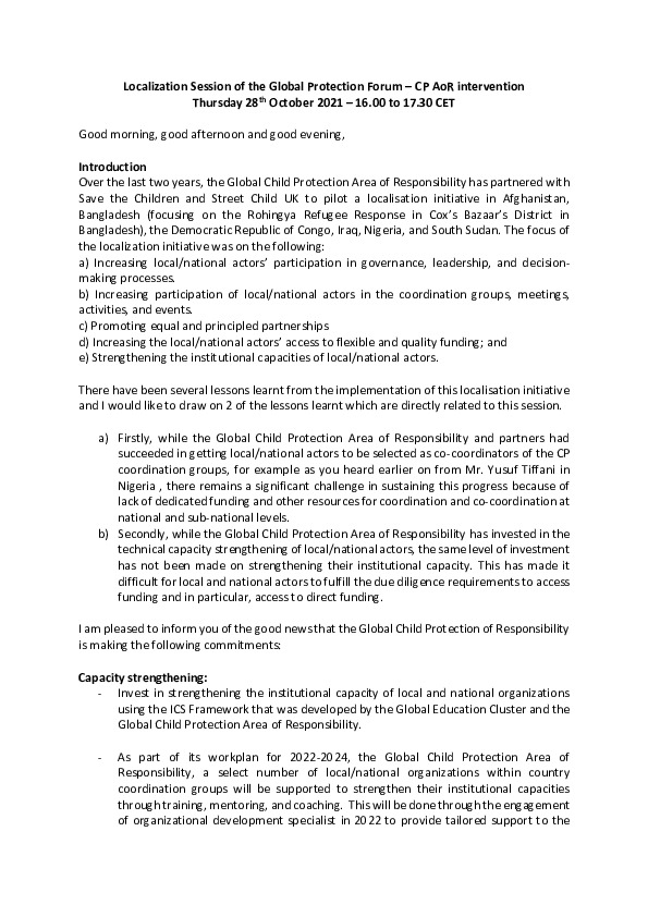 CP AoR Opening Remarks, Translating IASC Guidance into Action: Participation, Representation and Leadership by Local and National Actors in Protection Coordination, Global Protection Forum 2021
